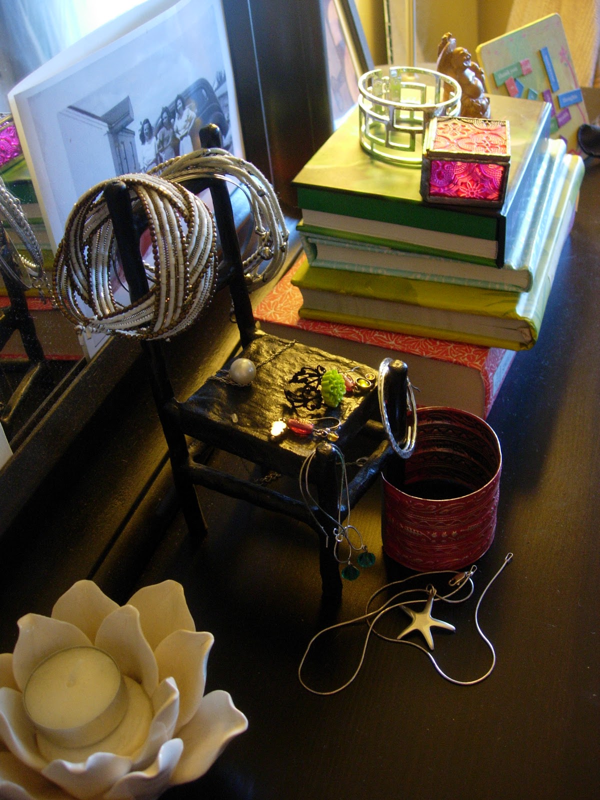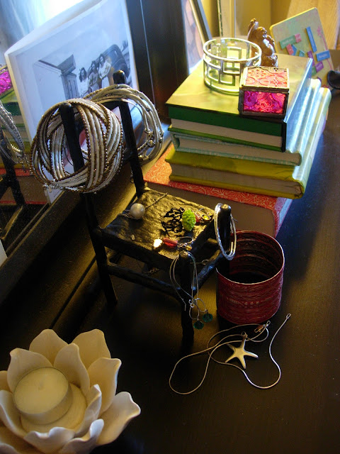 This is what it looked like prior to beautiful shell dish 😉 All of my stuff was just thrown on the little iron chair, I needed an intervention ( I know, this isn’t a lot of stuff, but it was still a mess I looked at everyday and thought, I need to do something about this)