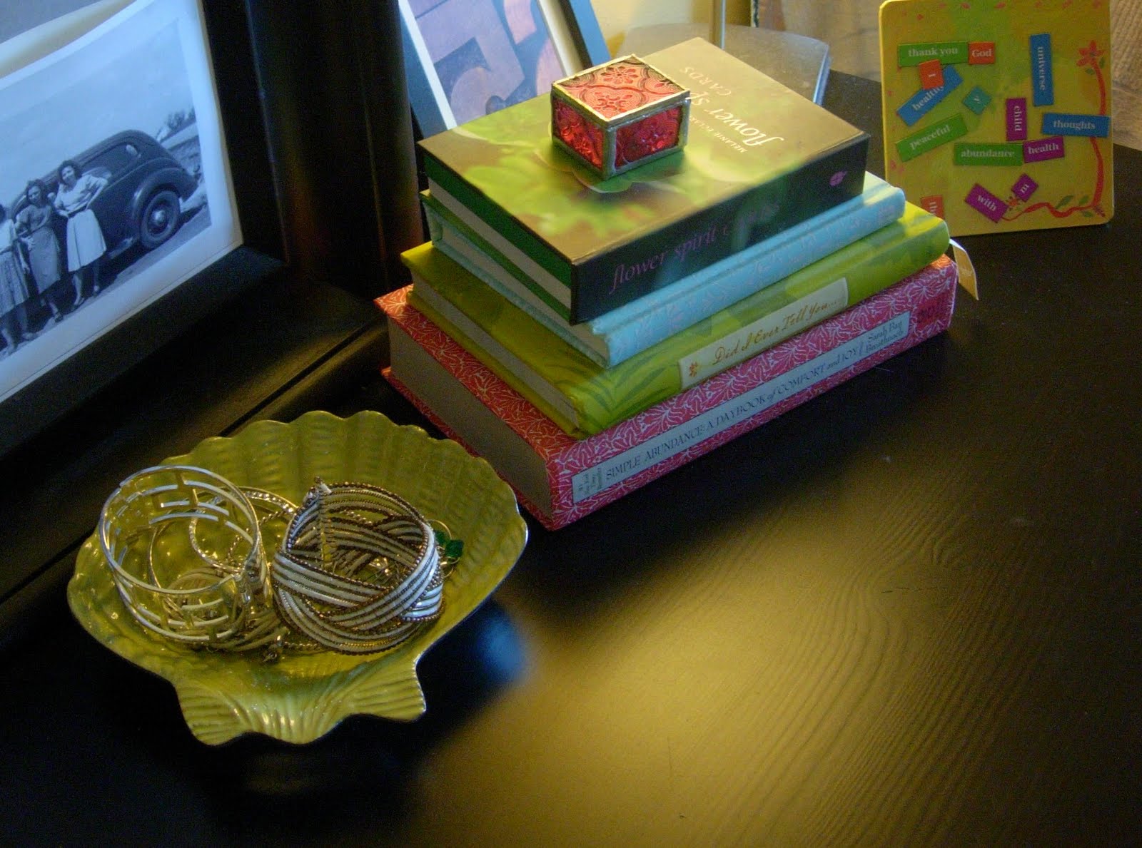 It fits in perfectly with the colors on my dresser! Yay!! Can I just mention also, completely off the subject of my little shell, the picture of the three woman you see, its a picture of my gramma and her sisters, I love this picture so much, when I look at it, I feel like I am right there standing against the car with them, a true vintage piece. love….
