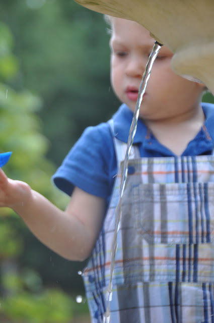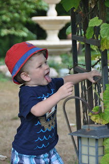 Now, for a few outside shots, most of them include, Liam, but what a beautiful yard, with A grape vine arbour, bright flowers, and a serine water fountain!!