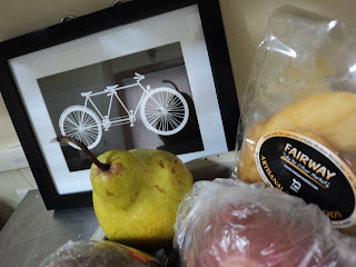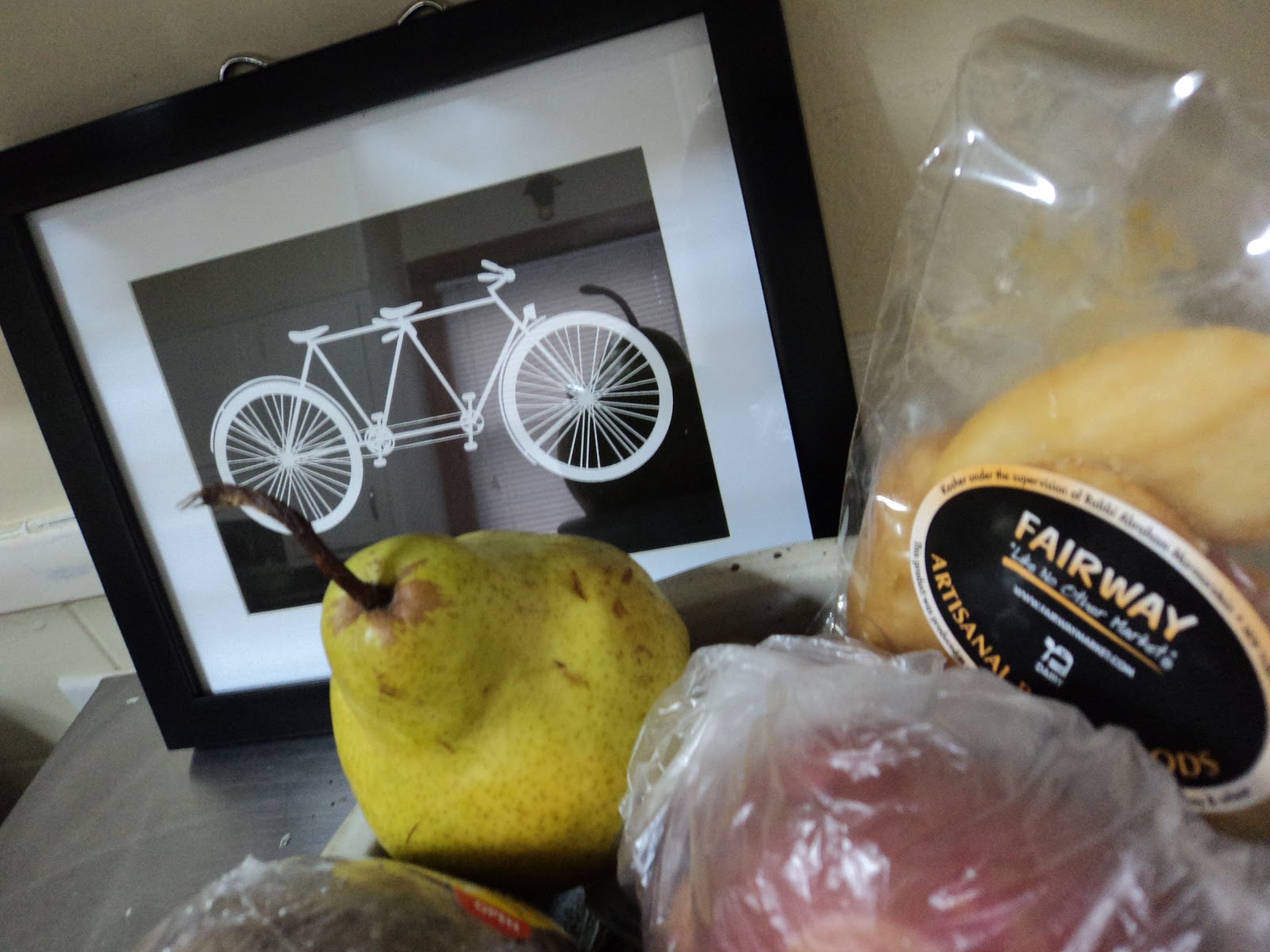 I filled the bigger ones with cereal, and the smaller ones with Liam’s snacks. The large Jar was $9.99 and the Med. Jars $3.99 and small jars $2.99 what a deal!! I added a ceramic bowl I already had, for produce, and a small bicycle print that I was actually going to hang in our bathroom, but I like it better here.