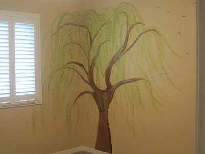My baby was a girl.  Knowing that another baby was in our future, I painstakingly left the room neutral and went a bit nutso when we moved her into a big girl room.  Itching to get murals on the wall, I got started right away…on another tree.  Not very imaginative, I know.  But my daughter was just starting to talk as we transitioned her to her new room.  She loved the tree in her room, would always point to it and in that sweet little voice of hers she would say “chee, chee”.  Hormonal again from baby number two, I felt guilty for moving her from her tree…so whalla – another tree.