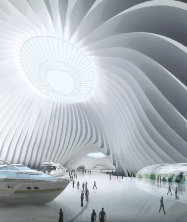 The Taichung Convention center by MAD Architects has a draping exterior skin that naturally ventilates the structure and generates energy from solar power. The interior framework is also expressed thru free forming folds.