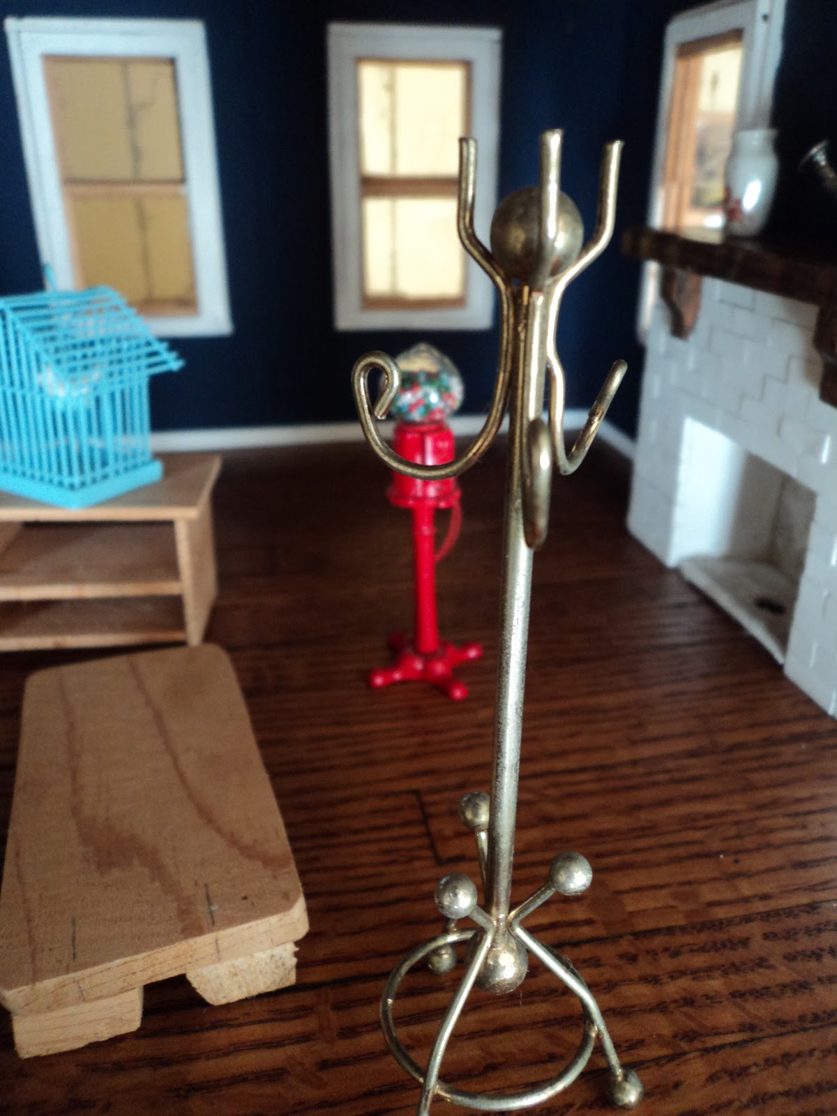 Also, I went through all of my old “furniture” most of it hand made by me when I was 9…I think I might use a few. Also found a pretty sweet brass coat tree in my stash, and an old bubble gum machine ornament..oh, and what dollhouse doesn’t need a fake bird ahahaha!!
