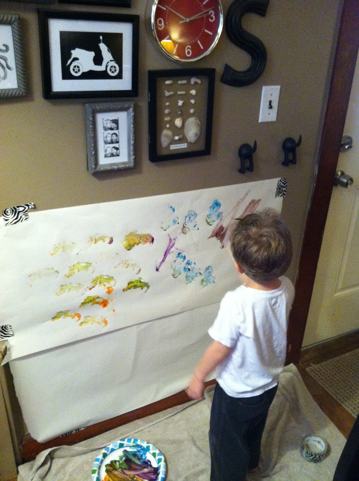 Do you have kids? are you stuck inside because of hurricane Sandy? Well, here in New York, we are! The timing of her arrival keeps getting pushed back, and I am happy about that!! But in the mean time, I have a 3 year old who is already getting stir crazy, so I thought..I guess Ill let him paint the wall!! 😉