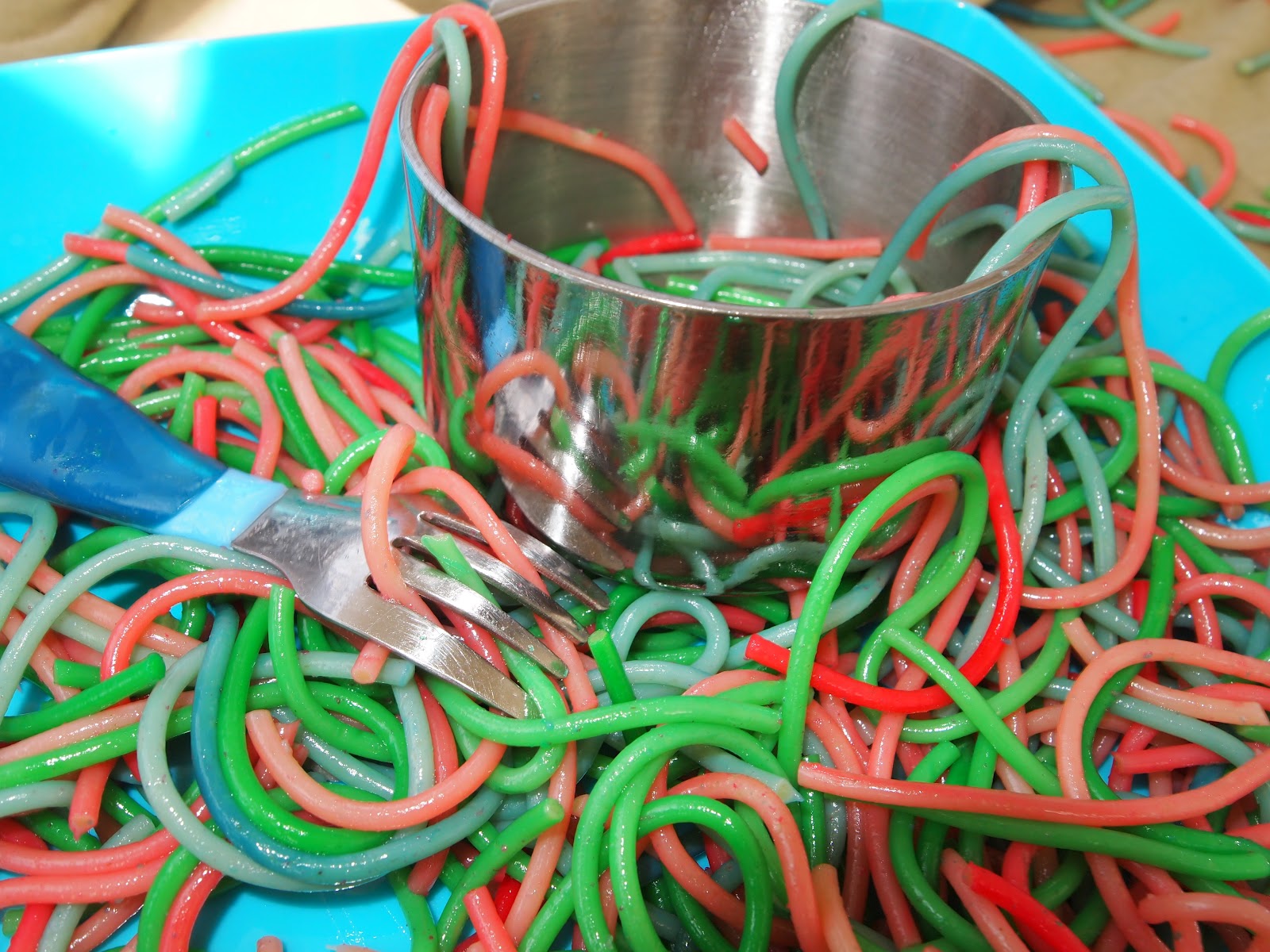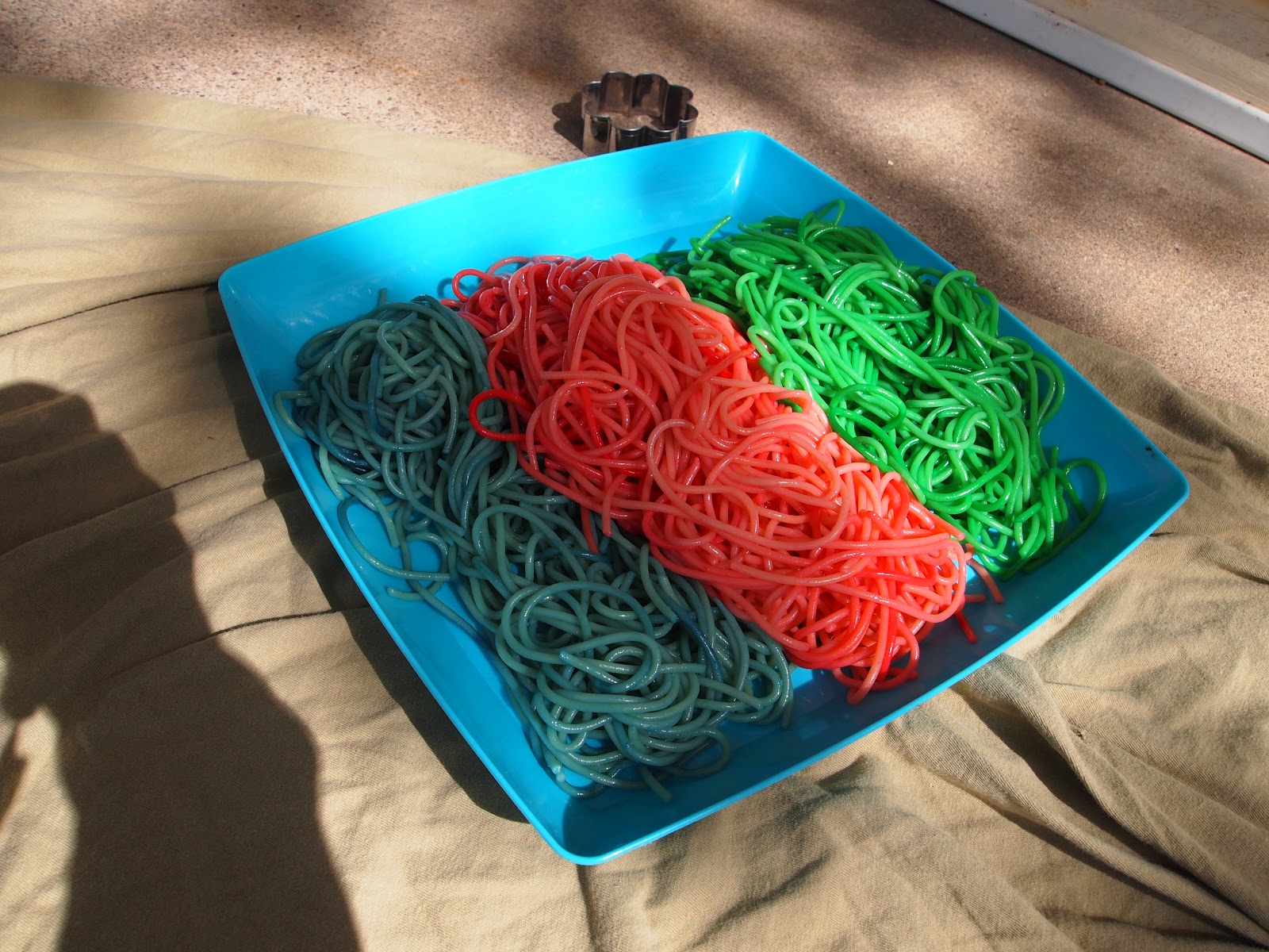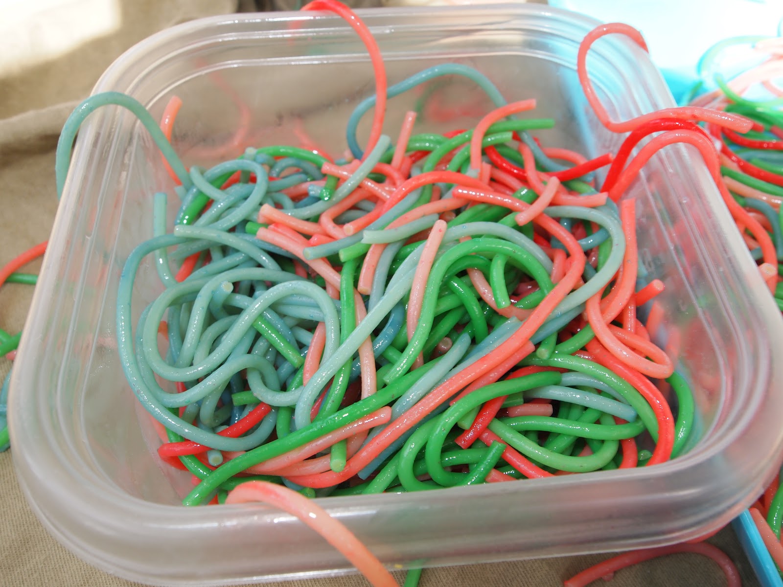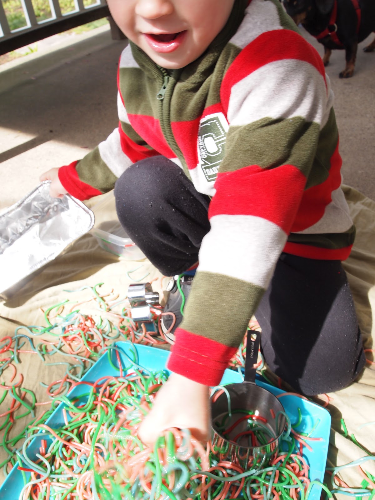 Liam LOVED this project!! He was totally able to help, which of course, is MAJOR for an almost three yr old, and once the noodles were colored, we had fun cutting, and dividing and just feeling them! I love food projects because I don’t care if Liam eats it!! Which he did, and so did our weenie, I’mah ;). It was a beautiful day So I set this all up on our front porch. I know some of you I told about this wondered if the food coloring stains..my answer is..Kind Of…Its not the type of staining that I care about, meaning, Liam had some green on his fingers afterwords. Just make sure they are in old clothes.