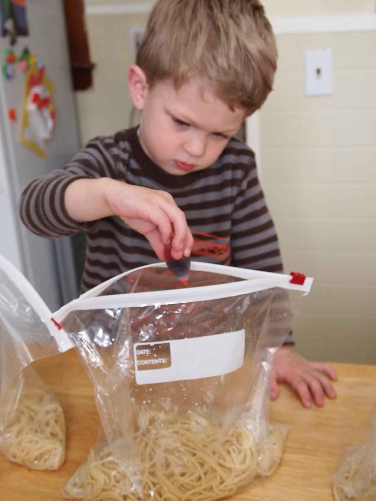 STEP FOUR: Add about a TSP of EVOO to each bag and squish it around to coat the noodles, this helps them to not stick together once you add the food coloring. ( I let Liam do this part and he loved it)