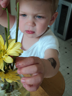 This morning, I sat back and truly enjoyed the wonder of an almost two yr old, simply eating cereal, and rearranging my flowers, with no limits, no rules, I just wanted to see what would happen…and it was beautiful…