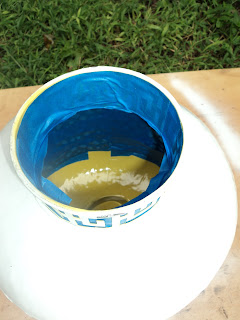 My first task was to cut a hole in the bottom of the candle holder, which would eventually be the top of my light fixture, here is where my first set back happened..G didn’t have a hole saw, so we tried to do it with his dremmel tool, terrible!! so with in the very first 1/2 hour, I had to run to Home Depot JUST to get the hole saw for G’s drill, I was NOT happy..I just wanted to PAINT already!
