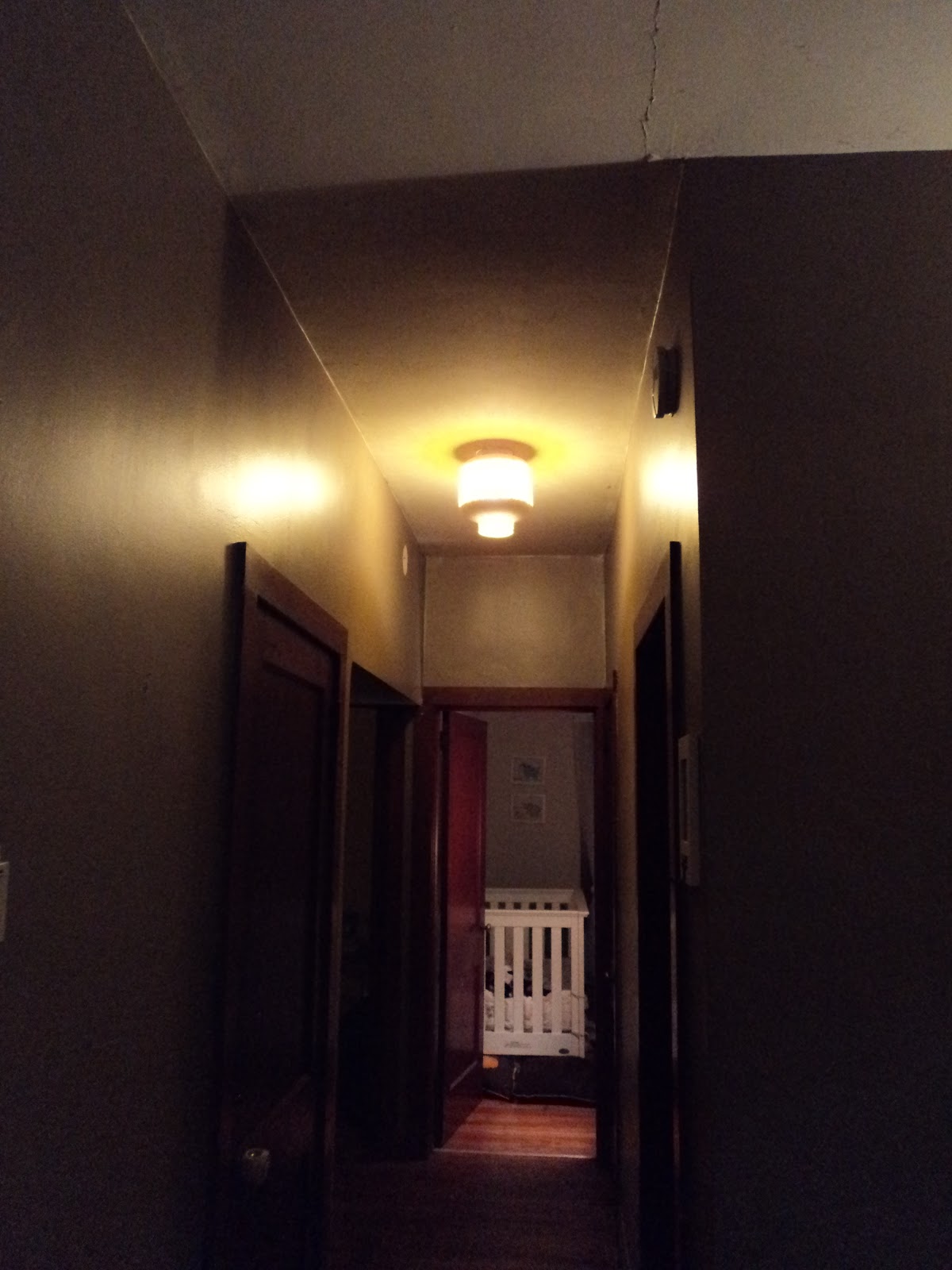 To all of you that guessed what I would be doing this weekend, you were RIGHT!! “Painting the inside” and “lighting something” is exactly what I did!! I took a large pillar candle holder, and turned it into our hallway light fixture!! I’m so excited!!