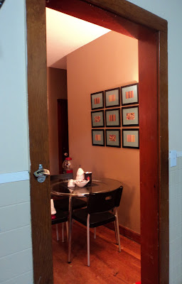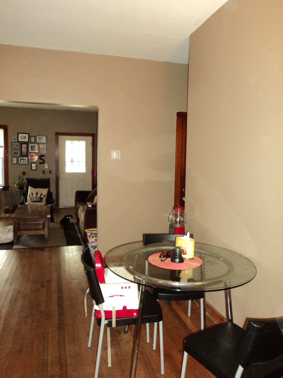 Here is what I started with…A huge, 9′ -0″ Clay colored wall, with NOTHING on it…this is a good spot by the way, to mention that for five of the seven years we lived here, G and I never had a dining room table, we had a pool table. That could be an entire post all on it’s own, but when I got prego, I insisted on getting rid of the pool table and getting a dining table….this little guy is actually NOT my style ( only because glass+little fingers = finger prints) but who can resist a curb side glass table and 4 ikea chairs?? that’s right, they were FREE, why? because I took them out of someones trash. I’m not ashamed.