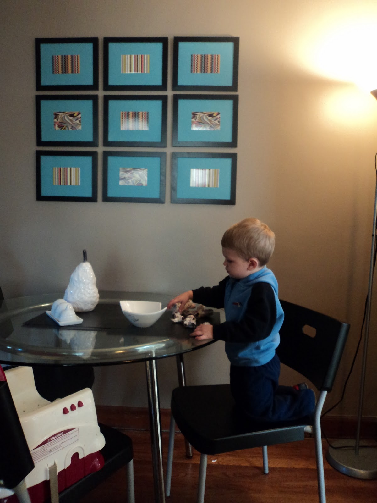 Here is what I started with…A huge, 9′ -0″ Clay colored wall, with NOTHING on it…this is a good spot by the way, to mention that for five of the seven years we lived here, G and I never had a dining room table, we had a pool table. That could be an entire post all on it’s own, but when I got prego, I insisted on getting rid of the pool table and getting a dining table….this little guy is actually NOT my style ( only because glass+little fingers = finger prints) but who can resist a curb side glass table and 4 ikea chairs?? that’s right, they were FREE, why? because I took them out of someones trash. I’m not ashamed.