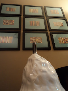 First, I went to Ikea and purchased 10 black frames for $1.99 ea. I only needed 9, but A good DIY tip..buy at least one more than you need!! Then I decided on the background color, I was originally going to do Ivory, but as I laid things out, it was way too boring. I ended up deciding on A Turquoise that coordinated with the “prints”.  Next, I laid out each frame, with a print on top, to figure out the exact layout I wanted….cut the Turquoise to fit,using the frame insert,  cut the cards in half, (using an exacto knife and metal scale ruler, so they were even and straight) and Voila!! 9 beautiful Missoni “Prints” to liven up my super boring, super high ceiling dining room!