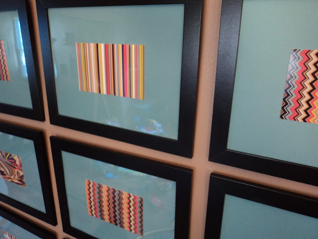As I wrote about on Wednesday, I recently purchased some Missoni for Target ,Folders and note cards. My plan was to make the folders into framed wall art, for a lot less expensive then the $34.99 versions, that Target was selling. As I began to lay out the folders, I realized the print was too large, so, I decided to use my note cards!!
