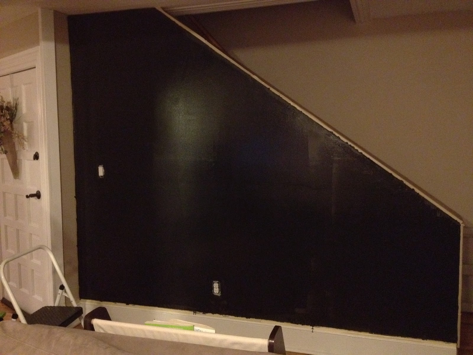 Here is the “before” wall, just your regular, staircase partial wall. (NOT ANYMORE!!) This is a typical spot that gets forgotten in people’s homes!! Chalkboard Paint is a great, creative solution!