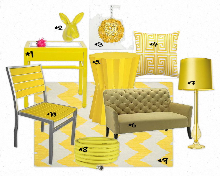 Happy Wednesday!!! I am so excited that Spring is here!! Looking around and seeing trees with leaves and tulips growing!! I Love it!! So its no surprise that I have been inspired by the color YELLOW. Its what I am enjoying right now!! its so fresh and clean! Take a look at a few of my picks! ( PS…yes, this is a mood board, NO,  I would never use all of these items together !)